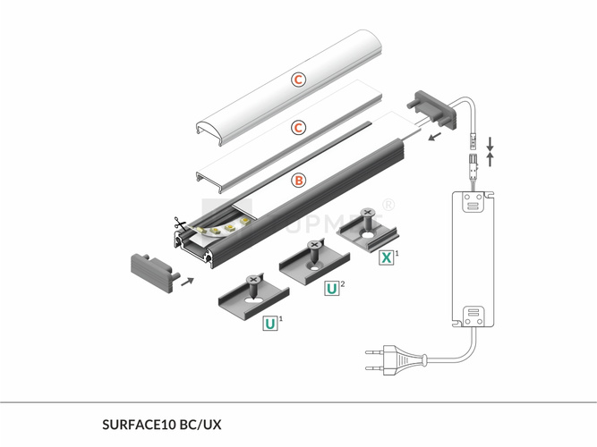 It is recommended to mount SURFACE10 LED profile using dedicated U mounting plate(cone U mounting plate – veneering the profile with the mounting surface; U mounting plate – keeping the profile with a gentle distance from the mounting surface). It is also possible to use X mounting plate, which require the insertion of the profile, unlike U mounting plate - click in the profile. The profile can also be mounted with screws, mounting glue or good quality double-sided tape.