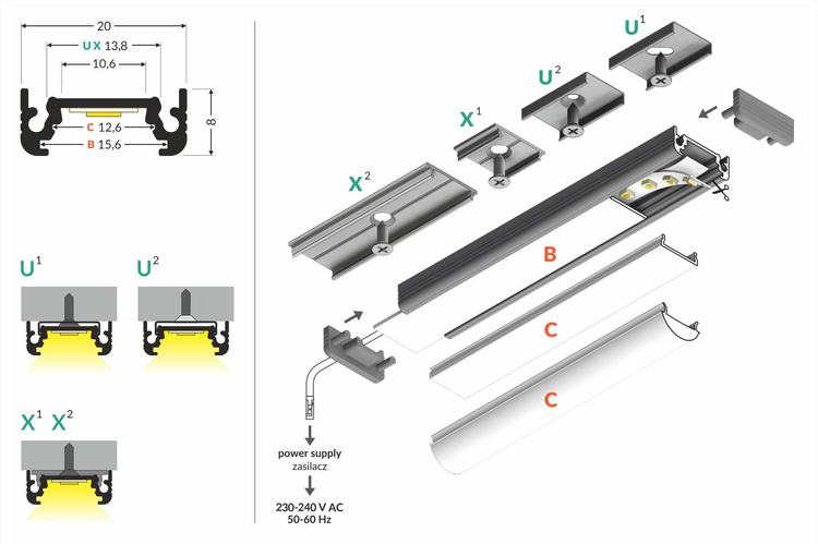 Slide cover (signifying: A, B, E, G, H, J, A9) – made of plastic with three transparency levels (transparent, frosted and opal). It is necessary to insert diffuser cover from the beginning of the profile and drag along the marked socket or click into the Slick socket.