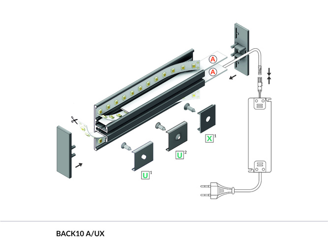BACK10 – special profile. "T" shaped luminaire construction enables to turn the light beam in two directions- top, down, left, right - for example on rear wall of furniture without necessity of lighting up glass shelves. It's an easy way to achieve really interesting light effect mounting the luminaire directly to the wall.