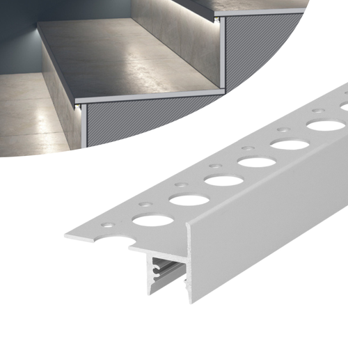 An under-tile stair profile equipped with well-matched LED tape not only provides sufficient light but also ensures an aesthetically pleasing finish for step edges. Its elegant design with a smooth front surface complements interiors of various styles. The LED strip profile includes mounting holes, allowing for easy installation on tiles using mounting adhesive.