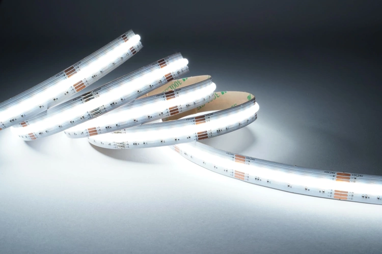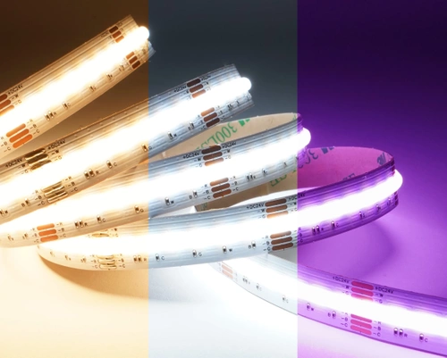 The COB RGB+CCT LED strip is equipped with RGB LEDs as well as warm white (3000K) and cool white (6000K) LEDs. This means that, with the use of a controller, you can set any color of light, as well as a pure warm white, neutral white or cool white tone.