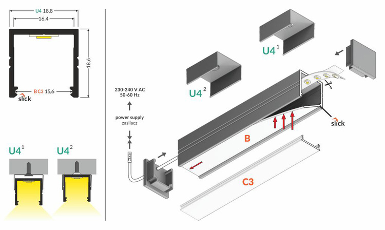 It is recommended to mount SMART16 LED profile using dedicated resilient mounting clip U4 (mounting clip U4 cone – veneering the profile with the mounting surface; mounting clip U4 – keeping the profile with a gentle distance from the mounting surface).