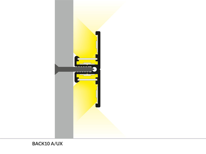 BACK10 – special profile. "T" shaped luminaire construction enables to turn the light beam in two directions- top, down, left, right - for example on rear wall of furniture without necessity of lighting up glass shelves. It's an easy way to achieve really interesting light effect mounting the luminaire directly to the wall.
