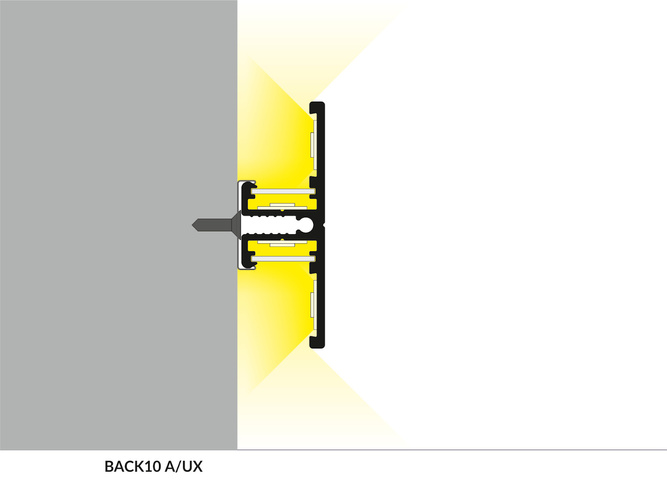 BACK10 – special profile. "T" shaped luminaire construction enables to turn the light beam in two directions- top, down, left, right - for example on rear wall of furniture without necessity of lighting up glass shelves. It's an easy way to achieve really interesting light effect mounting the luminaire directly to the wall.