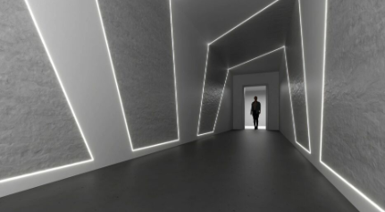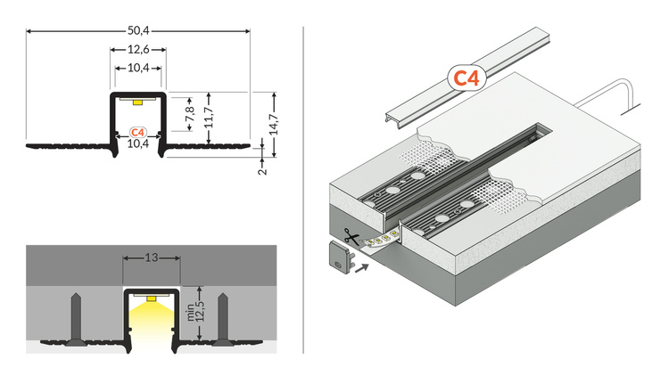 LED profile HIDE10 is a shallow aluminium LED profile for plasterboard. The simple form of the lighting profile, with its rather thin light line, makes it possible to create a variety of graphic compositions on ceilings and walls. Its small size, which allows the installation of LED strips up to 10 mm wide, means that the profile fits into the thickness of a standard plasterboard (12.5 mm). The LED profile HIDE10 is a model designed for plastering so that the aluminium surface of the profile is completely concealed and only the glow of light remains visible. It is recommended to reinforce the putty area of the profile with a reinforcing mesh under the gypsum.
