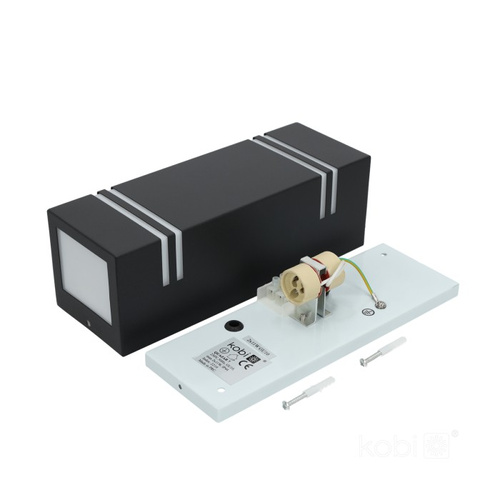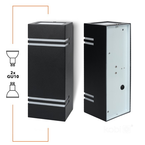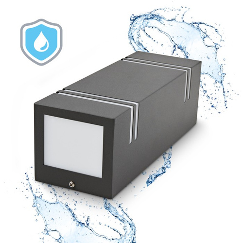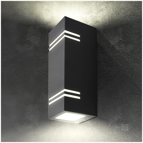 A modern wall light with a bi-directional light beam. Made of durable aluminium and plastic, it is perfect for use on house facades, terraces, or entrances.