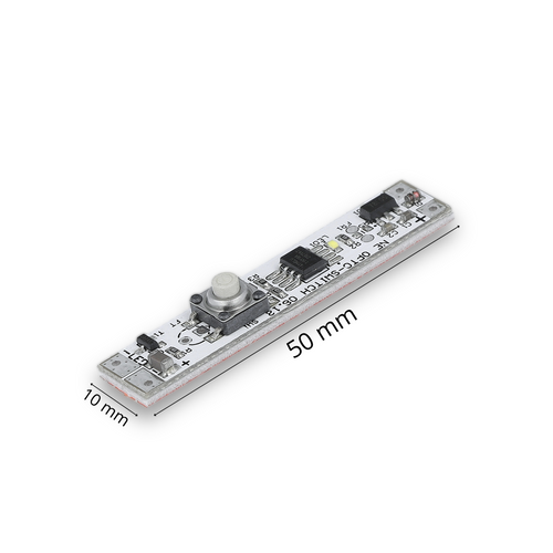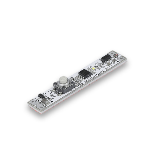 LED switch designed for installation in aluminum profiles, suitable for 12–24V LED strips. Maximum load: 60W (12V) or 72W (24V). Features a dimming function – simply press and hold the button to smoothly adjust the brightness. Ideal for furniture lighting applications.