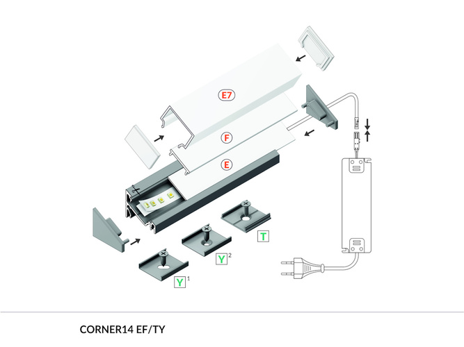 It is recommended to install the CORNER14 LED profile using a dedicated Y flexible mounting plate (Y cone, which will allow veneering of the profile with the mounting surface or Y flexible with a delicate distance) and a T mounting plate. The profile can also be mounted with screws, mounting glue or good-quality double-sided tape.